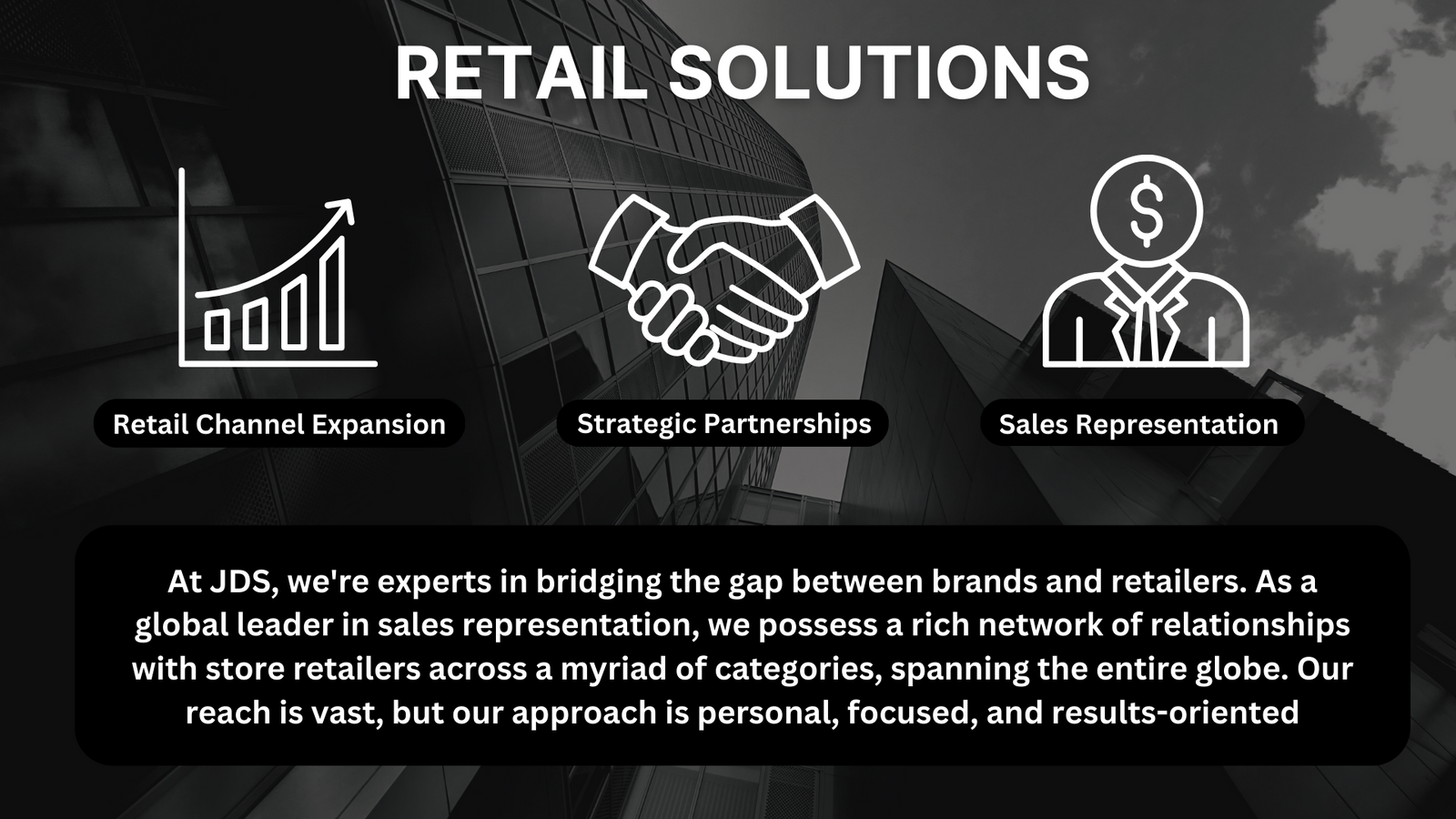 Founded on a simple yet profound vision, JDS is dedicated to empowering brands to reach their full potential. With a focus on e-commerce and retail sales services, we have crafted a unique approach that intertwines technological savvy, comprehensive market insights, and a vast global network.
